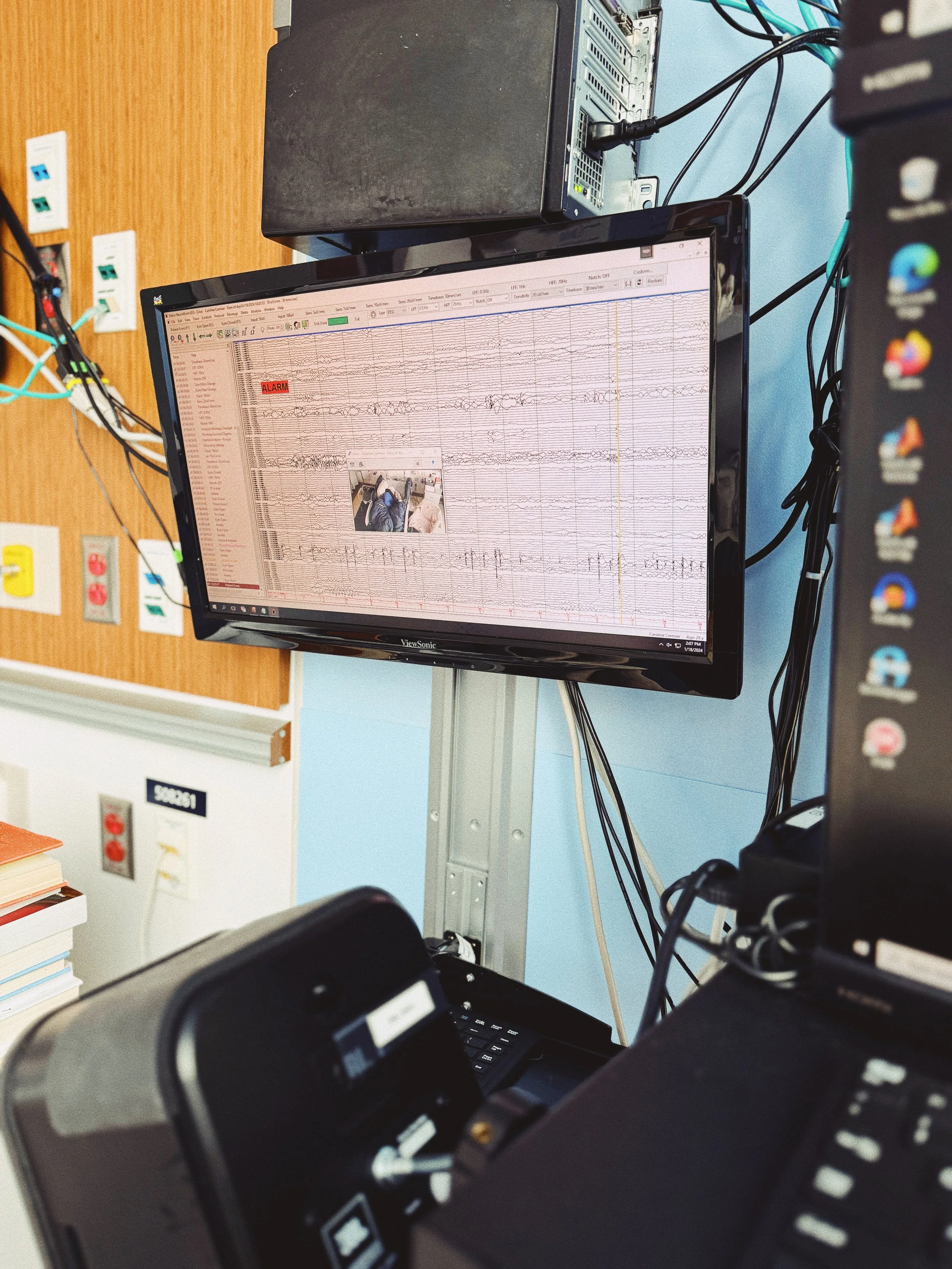 Unfortunately, Caroline only had one seizure last night. While we would normally call this a win in regular life, we need much more seizure activity captured while she’s undergoing the SEEG study. For context, Caroline usually has 5-8 seizures a night. While I’m here, I try to help out the Epilepsy Monitoring Team by describing what’s happening. Fun fact - they can see and hear everything that happens in this room 24/7!